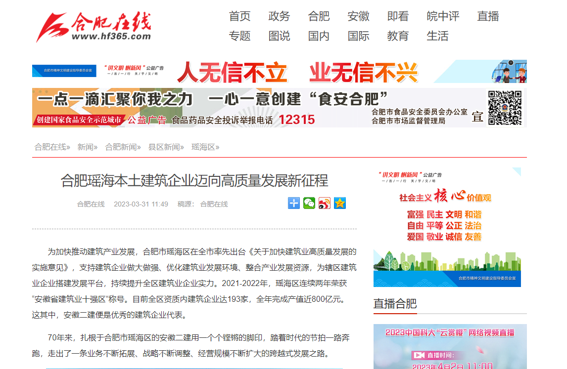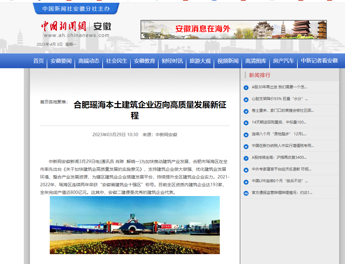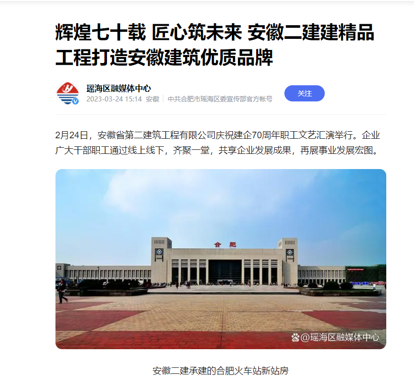 近日,新華網(wǎng)安徽頻道、中國(guó)商報(bào)網(wǎng)、中新網(wǎng)安徽頻道、市場(chǎng)星報(bào)、合肥在線、今日頭條-瑤海宣傳、瑤海區(qū)融媒體中心、金臺(tái)資訊、網(wǎng)易新聞、搜狐新聞、騰訊網(wǎng)、大公網(wǎng)等多家平臺(tái)媒體相繼報(bào)道安徽二建公司70周年發(fā)展成就。