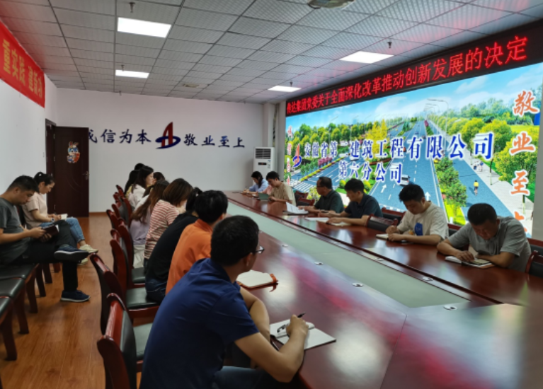 第六公司黨支部傳達學(xué)習(xí)安徽建工集團全面深化改革推動創(chuàng)新發(fā)展動員部署暨主題教育黨課報告會精神。會議要求,一要提高政治站位,統(tǒng)一思想認識,充分認識到集團深化改革推動創(chuàng)新發(fā)展是一項意義重大、影響深遠的綜合性改革,是集團在新起點上,把握新形勢新要求,謀劃新思路新發(fā)展的舉措,要全面貫徹落實建工控股黨委的決策部署,認真把握集團全面深化改革推動創(chuàng)新發(fā)展的歷史使命;二要緊緊圍繞集團戰(zhàn)略部署和工作安排,進一步樹立為集團大發(fā)展、轉(zhuǎn)型發(fā)展、高質(zhì)量發(fā)展作貢獻的責(zé)任和擔(dān)當(dāng)意識;三要認真落實集團工作安排,進一步做好市場開拓,搶抓市場先機,持續(xù)推進項目標(biāo)準(zhǔn)化建設(shè),嚴(yán)格落實集團、公司各項規(guī)定,樹牢風(fēng)險意識,做到“五個嚴(yán)”,持續(xù)推動公司改革轉(zhuǎn)型、高質(zhì)量發(fā)展。