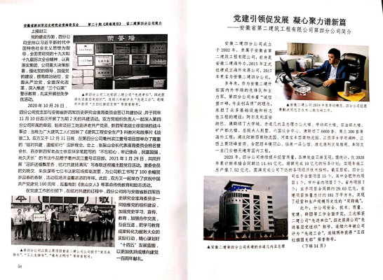 近日,由安徽省新四軍歷史研究會(huì)淮海委員會(huì)主辦的《淮海通訊》雜志第三十期刊登了安徽二建四分公司簡(jiǎn)介,同時(shí)介紹了雙方特色亮點(diǎn)共建活動(dòng)。