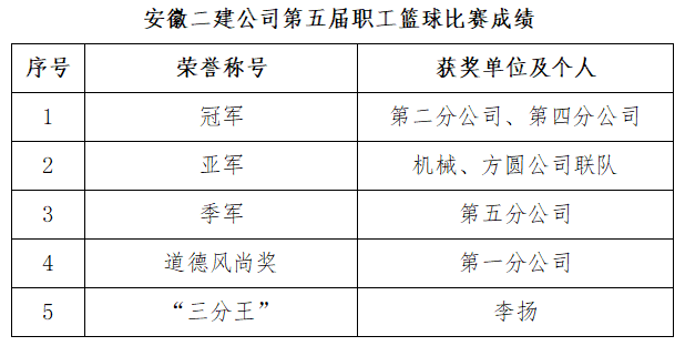 10月29日,隨著裁判的最后一聲哨響,為期三天的公司第五屆職工籃球賽結(jié)束全部賽程,完美收官。在公司領(lǐng)導(dǎo)的大力支持、所屬單位的積極配合,全體裁判員、運動員和工作人員的共同努力下,本屆比賽取得圓滿成功。各球隊秉承“友誼第一、比賽第二”和“重在參與、重在學習、重在提高”的原則,賽出了水平、賽出了風格、賽出了友誼,更賽出了二建職工團結(jié)一心、頑強拼搏、奮勇爭先的精氣神。