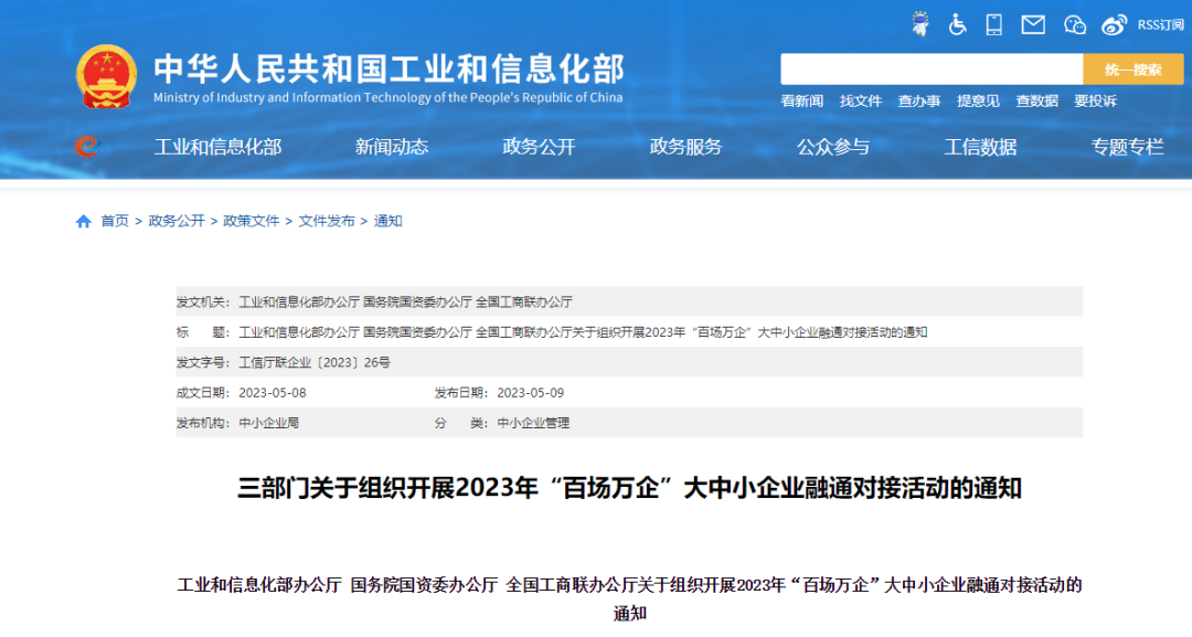 日前,工信部網站發(fā)布三部門關于組織開展2023年“百場萬企”大中小企業(yè)融通對接活動的通知。