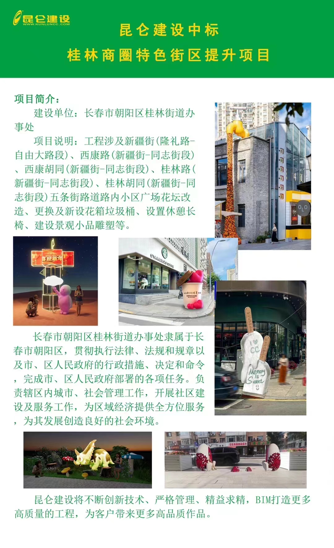 近日,長春市公共資源交易平臺發(fā)布長春市朝陽區(qū)桂林商圈特色街區(qū)改造提升項目中標公示,長春昆侖建設股份有限公司(以下稱“昆侖建設”)成功中標。
