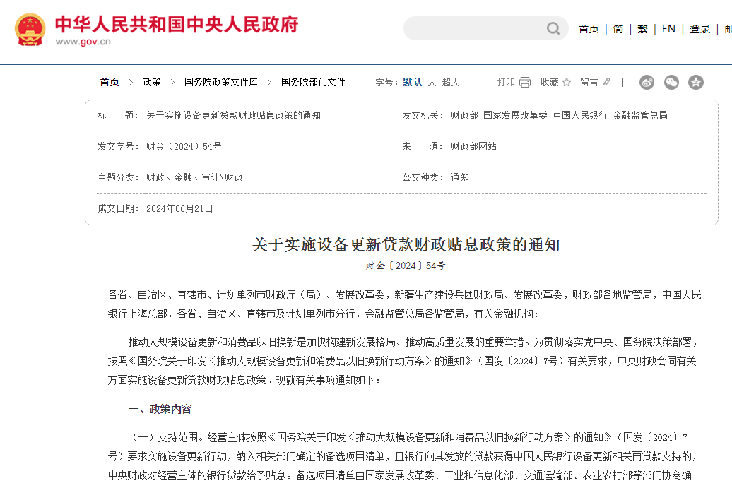 財政部、國家發(fā)展改革委、中國人民銀行、金融監(jiān)管總局聯(lián)合印發(fā)《關(guān)于實施設(shè)備更新貸款財政貼息政策的通知》。
