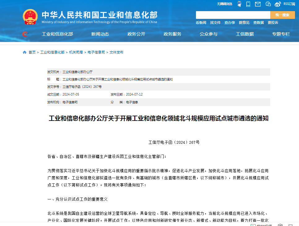 工信部印發(fā)通知,開展北斗規(guī)模應(yīng)用試點城市遴選