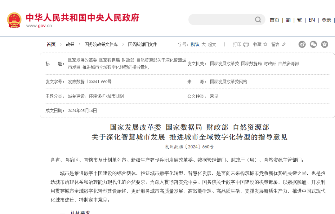 國家發(fā)展改革委、國家數(shù)據(jù)局、財(cái)政部、自然資源部聯(lián)合發(fā)布《關(guān)于深化智慧城市發(fā)展 推進(jìn)城市全域數(shù)字化轉(zhuǎn)型的指導(dǎo)意見》(以下稱《指導(dǎo)意見》)。