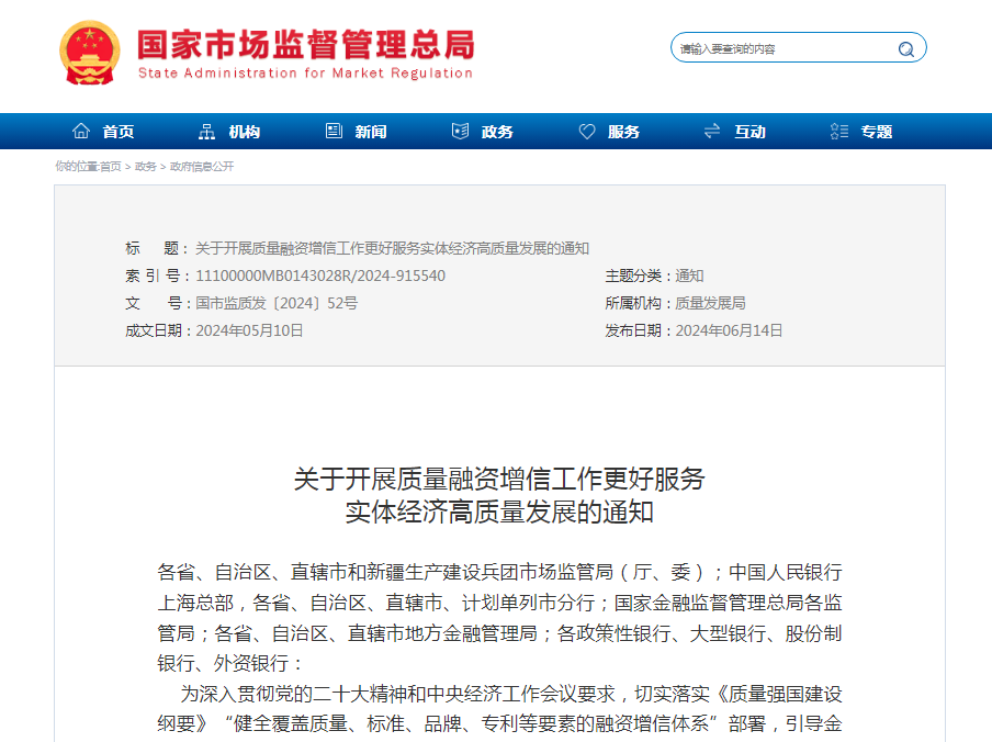 國家市場監(jiān)管總局會(huì)同中國人民銀行、金融監(jiān)管總局聯(lián)合印發(fā)《關(guān)于開展質(zhì)量融資增信工作更好服務(wù)實(shí)體經(jīng)濟(jì)高質(zhì)量發(fā)展的通知》,進(jìn)一步增強(qiáng)質(zhì)量政策與金融政策協(xié)同,助力實(shí)體經(jīng)濟(jì)發(fā)展。