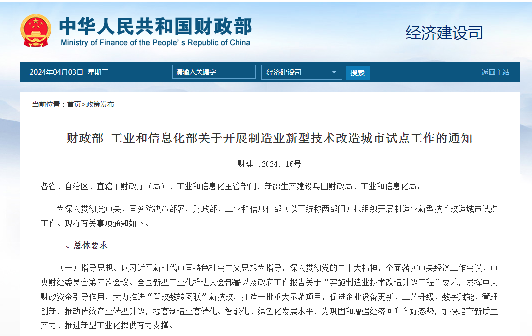 近日,財(cái)政部、工業(yè)和信息化部發(fā)布《關(guān)于開展制造業(yè)新型技術(shù)改造城市試點(diǎn)工作的通知》(以下簡(jiǎn)稱“《通知》”)。