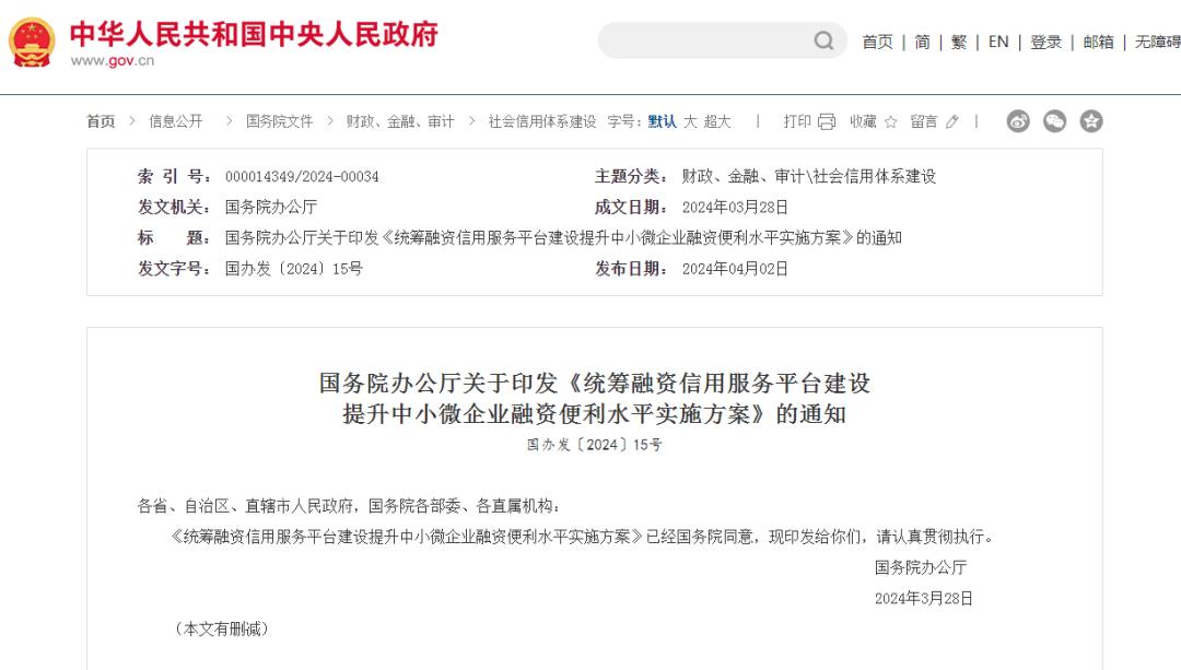 國辦發(fā)文:統(tǒng)籌融資信用服務(wù)平臺(tái)建設(shè),提升中小微企業(yè)融資便利水平