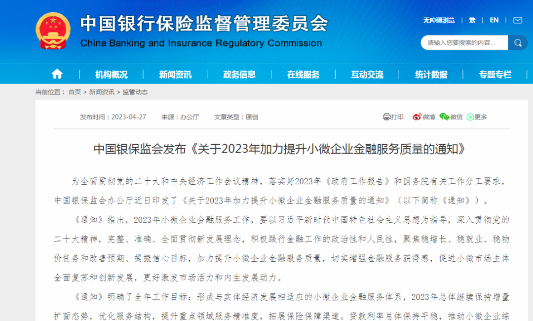 近日,中國銀保監(jiān)會辦公廳印發(fā)《關(guān)于2023年加力提升小微企業(yè)金融服務(wù)質(zhì)量的通知》(以下簡稱《通知》)。